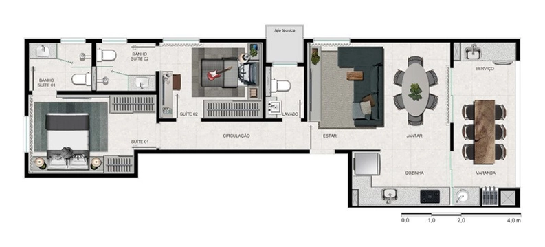 Veja a planta humanizada do SKY Solarium e entenda como os 2 ambientes de sala, as 2 suítes e a super varanda gourmet se integram para oferecer mais conforto no dia a dia